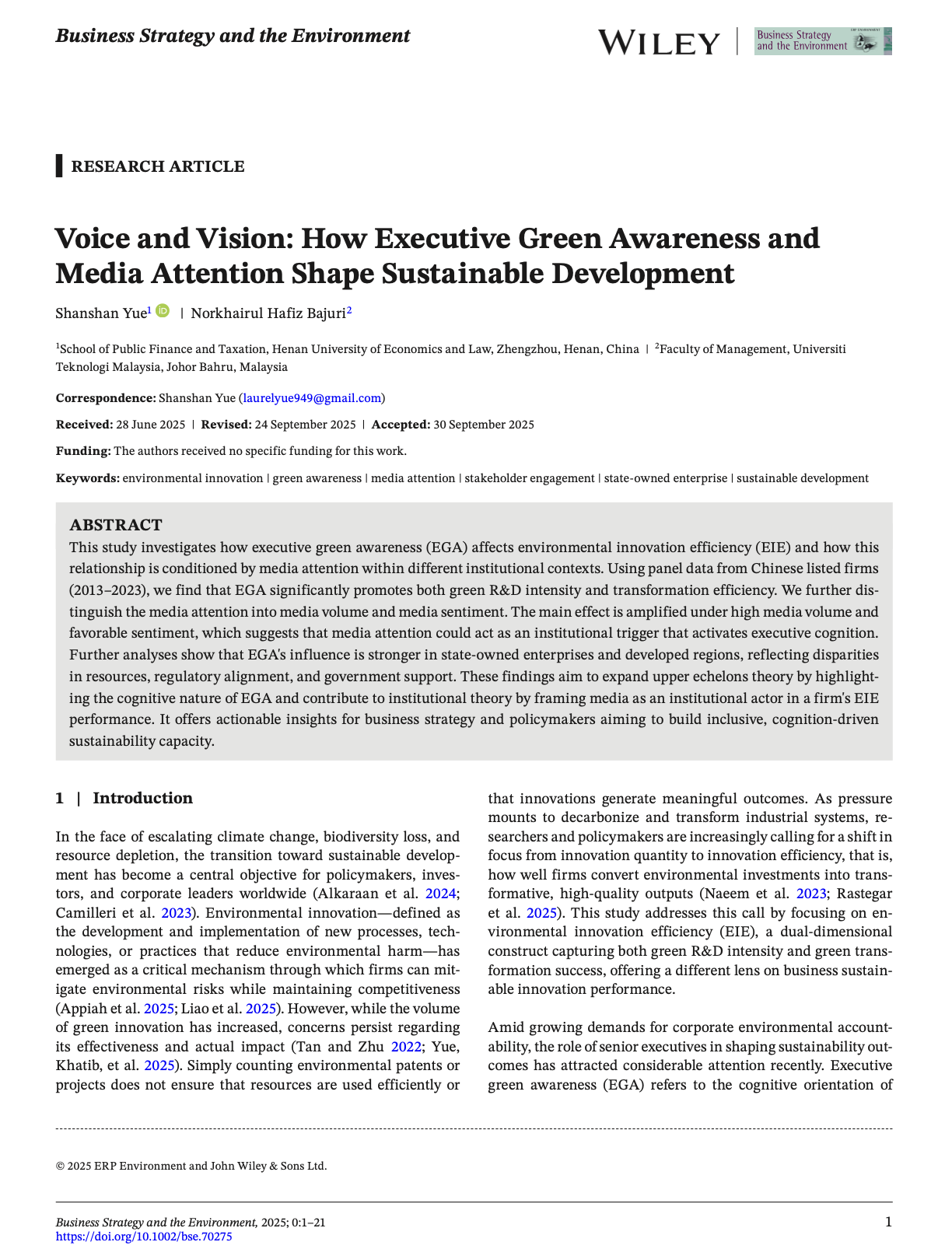 近日,bevictor伟德岳姗姗老师与其合作者共同完成的研究成果《Voice and Vision: How Executive Green Awareness and Media Attention Shape Sustainable Development》正式发表于国际顶级SSCI期刊Business Strategy and the Environment(Wiley出版,SSCI一区,中科院一区TOP)。该期刊为环境与可持续发展研究领域的核心期刊,在全球绿色发展与企业治理研究中具有广泛学术影响。