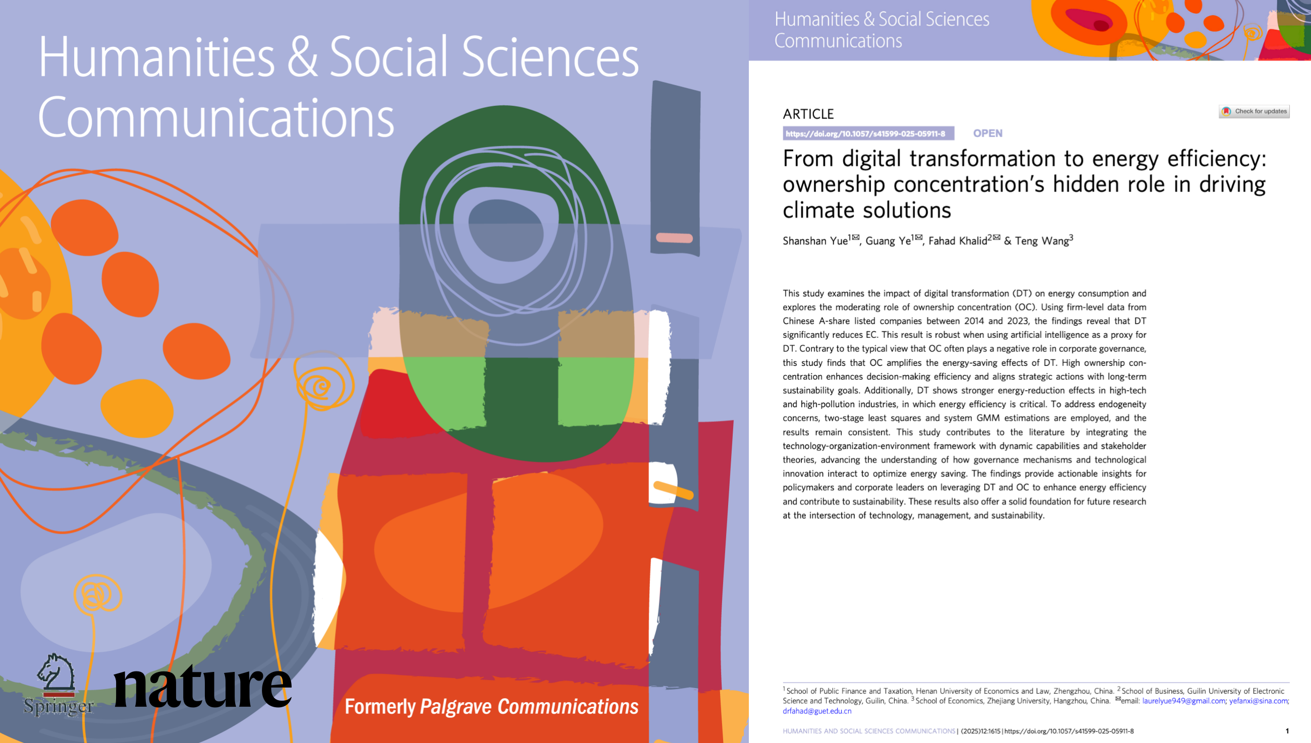 近期,bevictor伟德岳姗姗老师与我校叶光教授等的研究成果《From digital transformation to energy efficiency: ownership concentration’s hidden role in driving climate solutions》正式发表于国际权威期刊Humanities and Social Sciences Communications(《人文社科通讯》)。该期刊系Nature旗下唯一专注于人文与社会科学的旗舰期刊,致力于出版涵盖人文学科、行为科学与社会科学所有领域的高水平研究成果。该刊被A&HCI和SSCI双收录,在全球学术界具有重要影响力。在Web of Science期刊引证报告中,其在人文学科-多学科类409种期刊中排名第3,在社会科学跨学科类265种期刊中排名第1;JCR社会科学分区Q1,中科院人文科学一区。